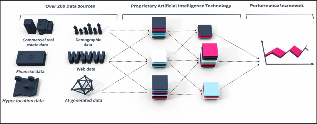 根據圖1中所展示的流程,AI技術的背後是龐大的資料庫支撐,包括商用不動產數據、人口統計數據、金融數據、網路數據、地理位置數據以及AI生成的數據等。這些資料進入到專有的AI技術模組中進行綜合分析,進而做出各種風險評估、信用判斷與投資建議。這不僅讓銀行在管理風險時變得更加精準,也讓用戶在接受服務時能得到更符合個人需求的產品建議。