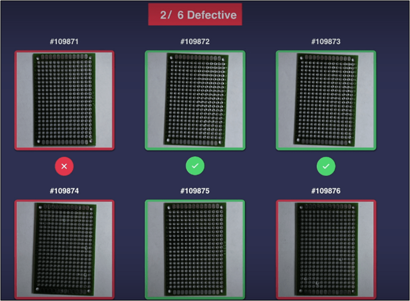 再來看圖2,這是AI在製造業中進行缺陷檢測的一個例子。傳統上,這類的缺陷檢測通常需要依賴人工目視,每天檢視上千甚至上萬張圖片,這對檢測人員來說是非常大的負擔,不僅費力且容易出錯。而現在,有了AI的幫助,我們可以透過影像辨識技術,自動對產品進行質量檢測。AI會學習大量的良品與不良品的特徵,並根據這些特徵快速分辨哪些產品存在缺陷。就像在圖2中,AI能立即指出哪兩個是有缺陷的產品,大幅提升了檢測速度和準確度。