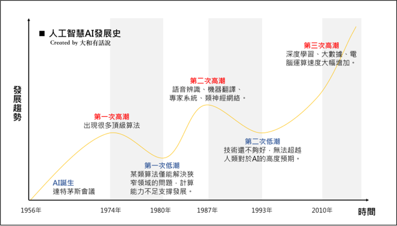 從1950年代的理論探索到1980年代的AI冬天,再到21世紀的技術復興,AI的旅程充滿了起伏。特別是近年來,高速運算器、大數據和先進演算法的結合,使得AI技術快速發展,並且在各行各業中發揮了革命性的作用。