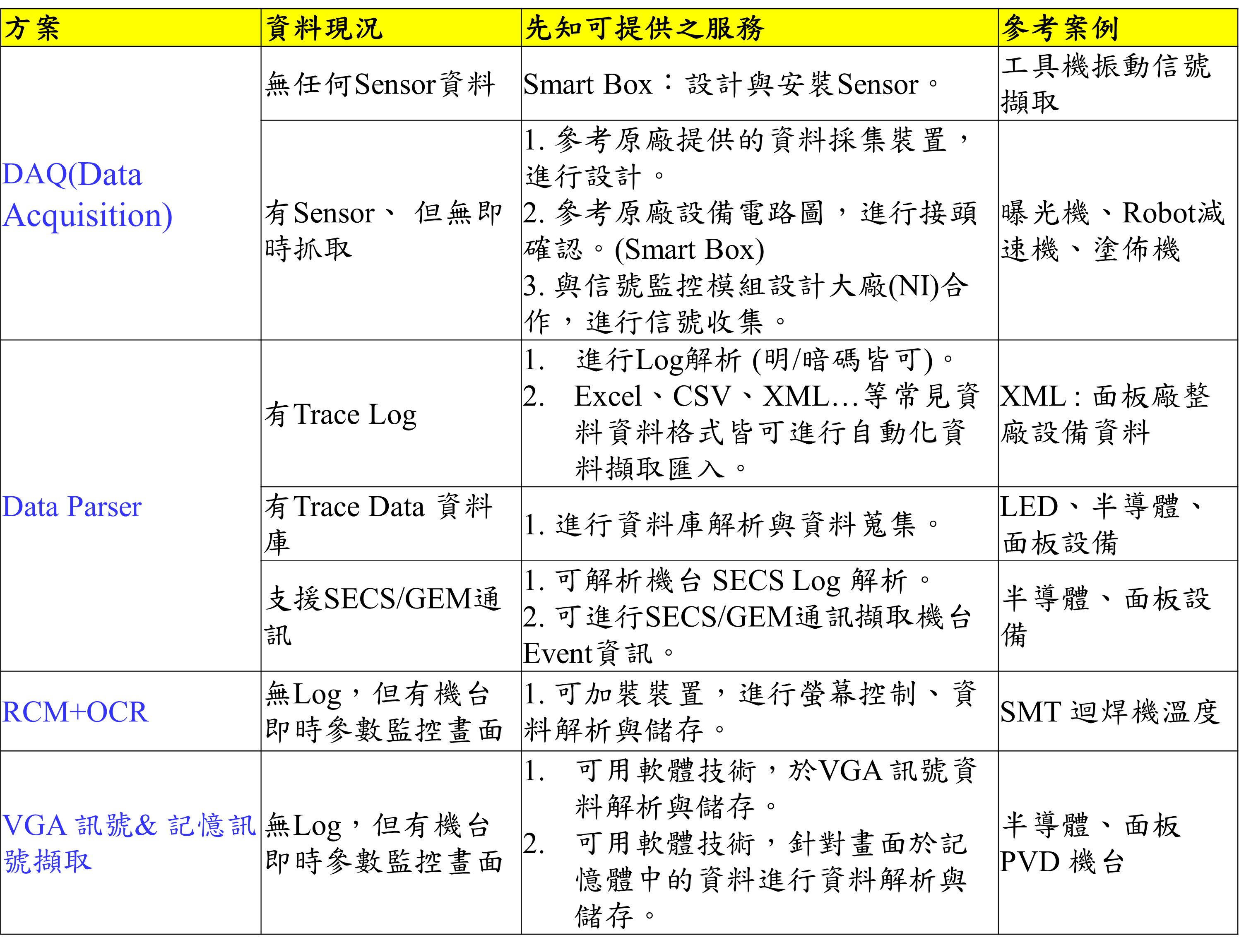 表1. 舊機台資料採集與互聯網方案