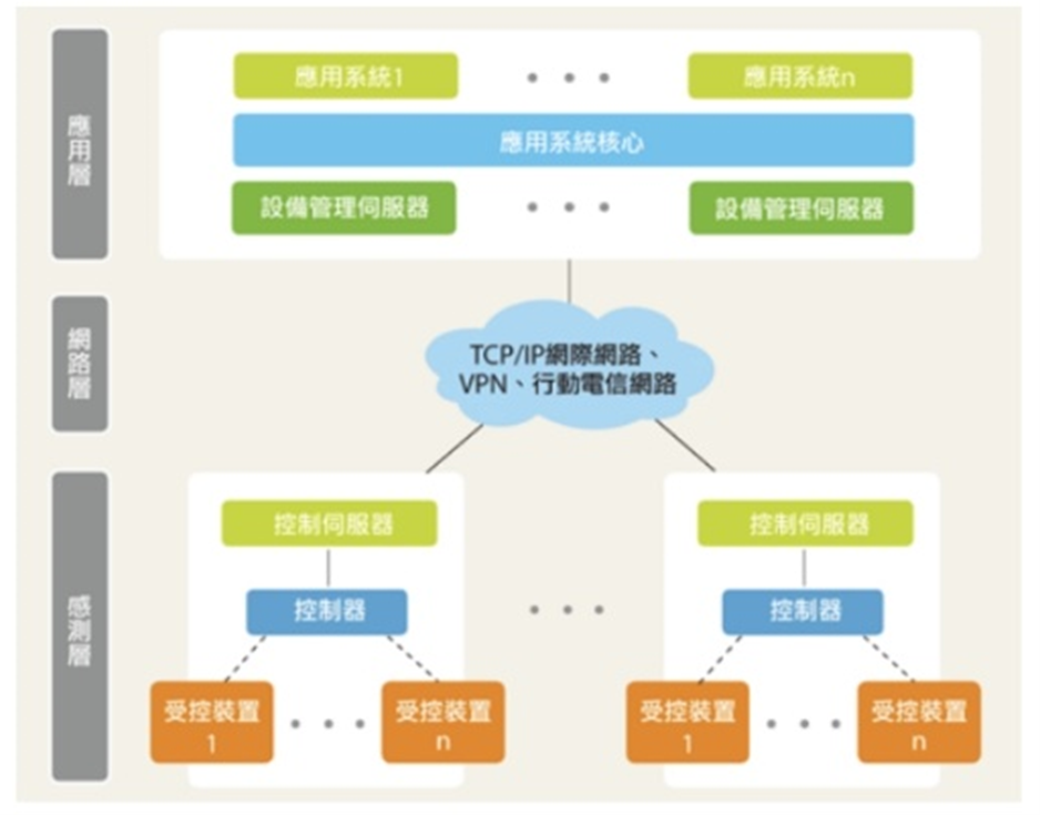 感測層的構架: 感測層主要由受控裝置、感測器、控制器及控制伺服器組成,是AIoT架構中負責直接與實體世界互動的部分。感測器能夠實時收集各種物理和環境數據,如溫度、濕度、壓力、光線等。這些數據經由控制器初步處理後,可以用於即時監控和反應,例如自動調節空調系統的溫度或啟動警報系統。