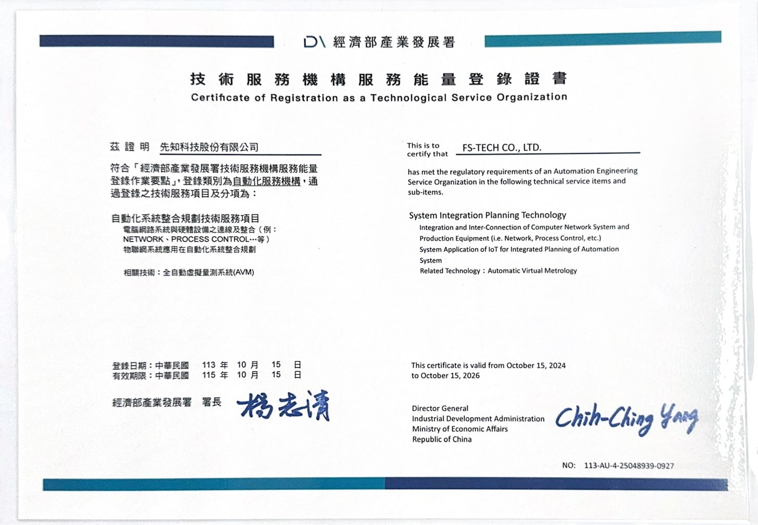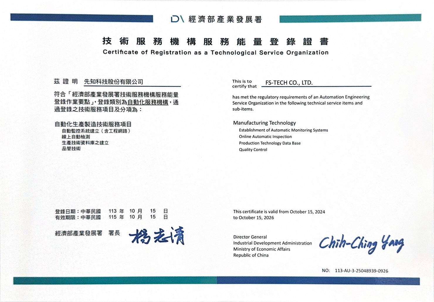 先知科技已獲得經濟部工業局的技術服務機構服務能量認證,並通過專業技術能力、執行管理能力及財務健全度審核,成功登錄於自動化生產製造技術服務和自動化系統整合規劃兩大項目。