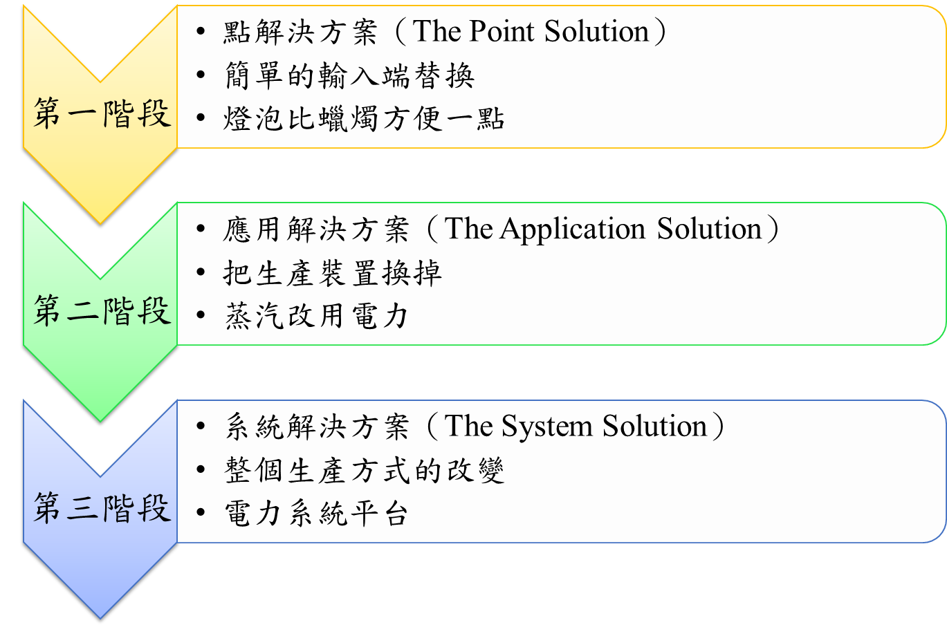 1.第一階段叫「點解決方案(The Point Solution)」,是簡單的輸入端替換。燈泡比蠟燭方便一點,用電力做動力有時候會比蒸汽動力便宜一點,你可能會有替換的意願。你的生活方便了一點點,你的成本降低了一點,但是僅此而已。