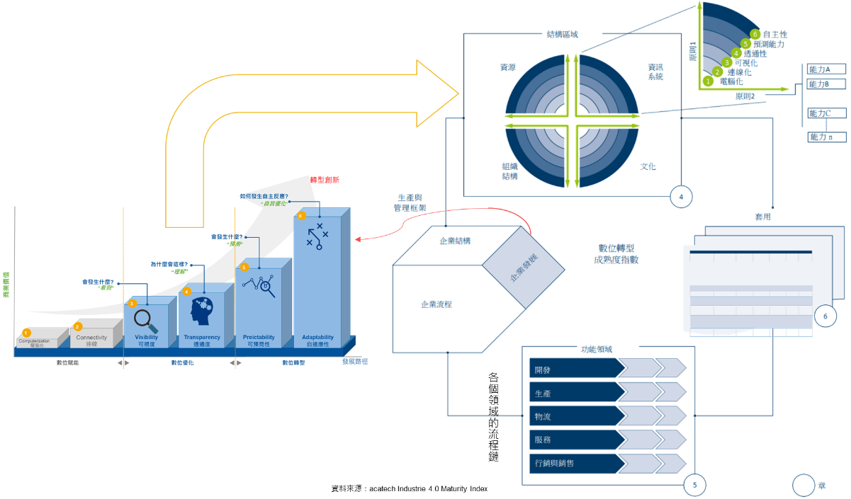 圖1是之前有提到的數位轉型成熟度針對企業生產與管理框架的整體調查概念,其中左圖是對應到”企業發展”的數位轉型發展路徑(圖1的左半部),其次是針對”企業結構”分析的結構區域(圖1的右半部上方),在這篇文章中,將詳細說明對應到”企業流程”分析的各個領域流程鏈(圖1的右半部下方),以及針對整體企業生產與管理框架的評分、分析及套用Roadmap 發展(圖1的右半部右方)。