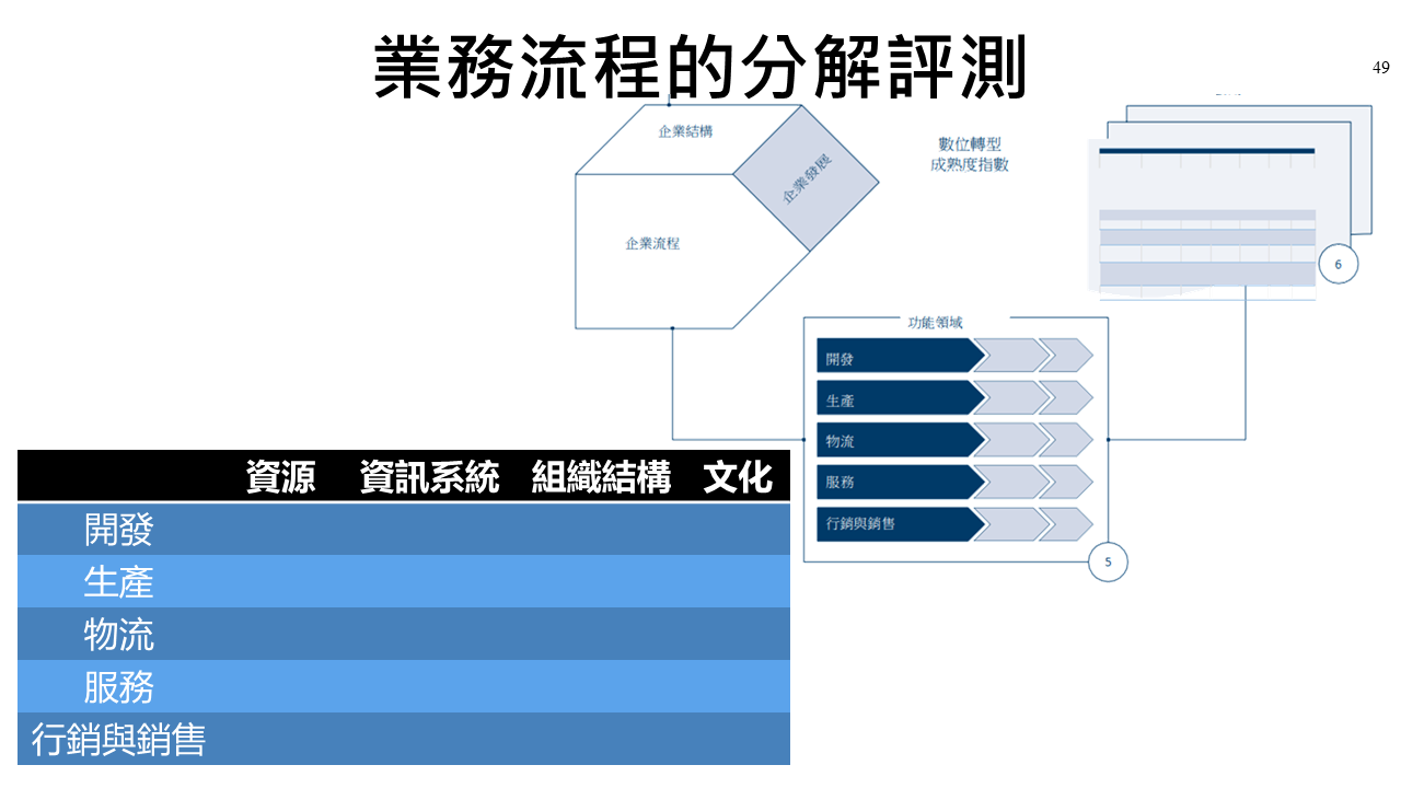 透過對這些構面進行評估,我們能夠深入了解整個相關業務流程的優勢和改進點。這為企業提供了制定數位轉型策略和計劃的依據,並幫助它們實現業務流程的優化和效能提升。