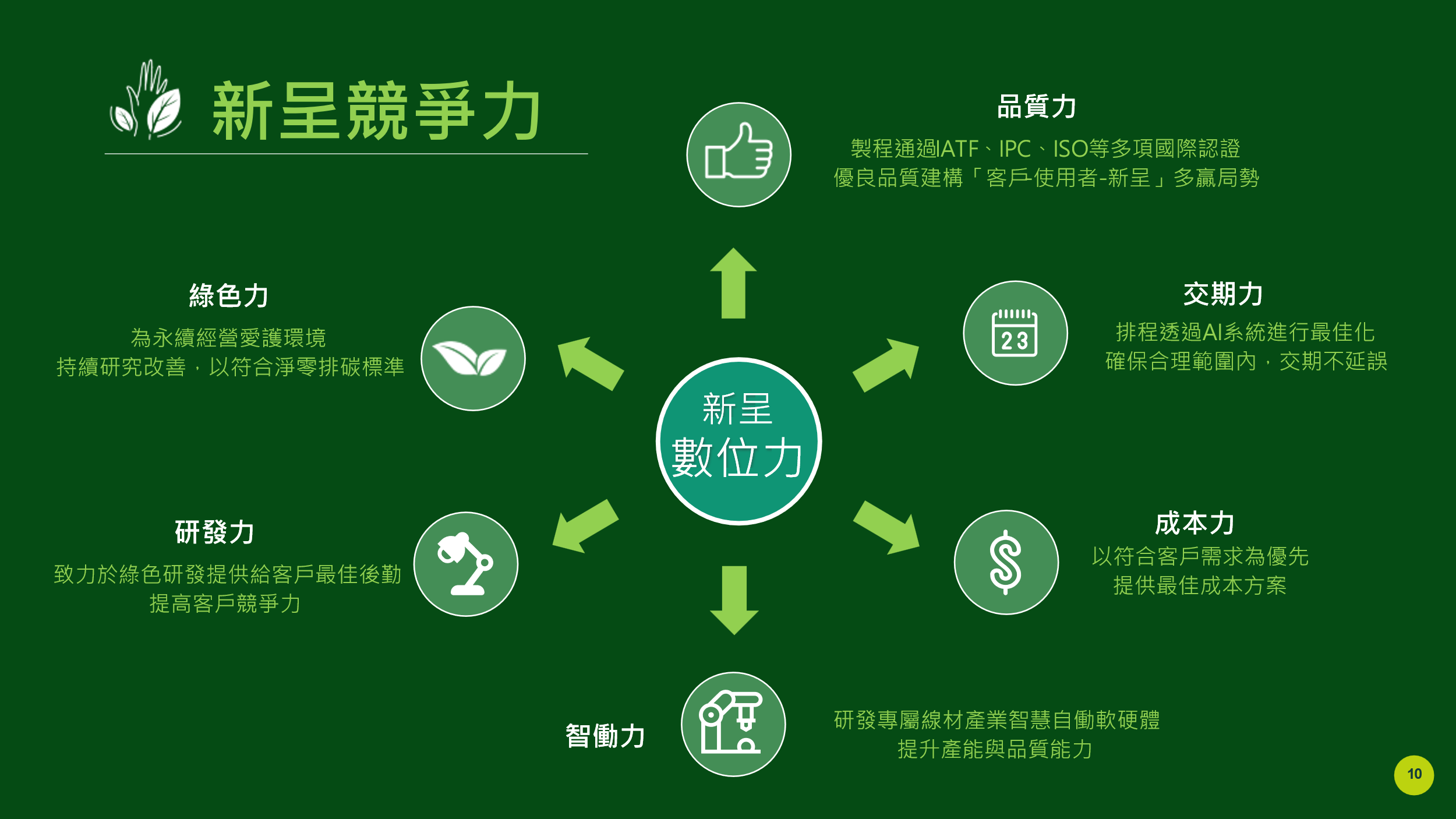 如圖1與圖2所示,新呈從供應鏈連結智慧生產打造智造體系,使用數位力整合外部供應鏈與內部價值鏈,如圖3以數位力為中心,來提升品質力、綠色力、研發力、智働力、成本力與交期力,並達成圖4的相關效益。