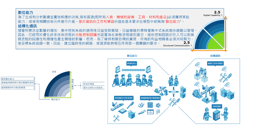 資源是否有數位能力,資源的帳與物是否進行整合資源泛指有行、有形、有型的資源,包括勞動力(人力資源)、機器設備、工具、材料和最終產品。正確配置技術資源可以減少資料和活動的延遲。企業確保資源在物理和數位世界有一個介面數位影子,提高公司敏協性所需要學習的過程,所以從這可以看到兩個原則數位能力和結構化通訊。