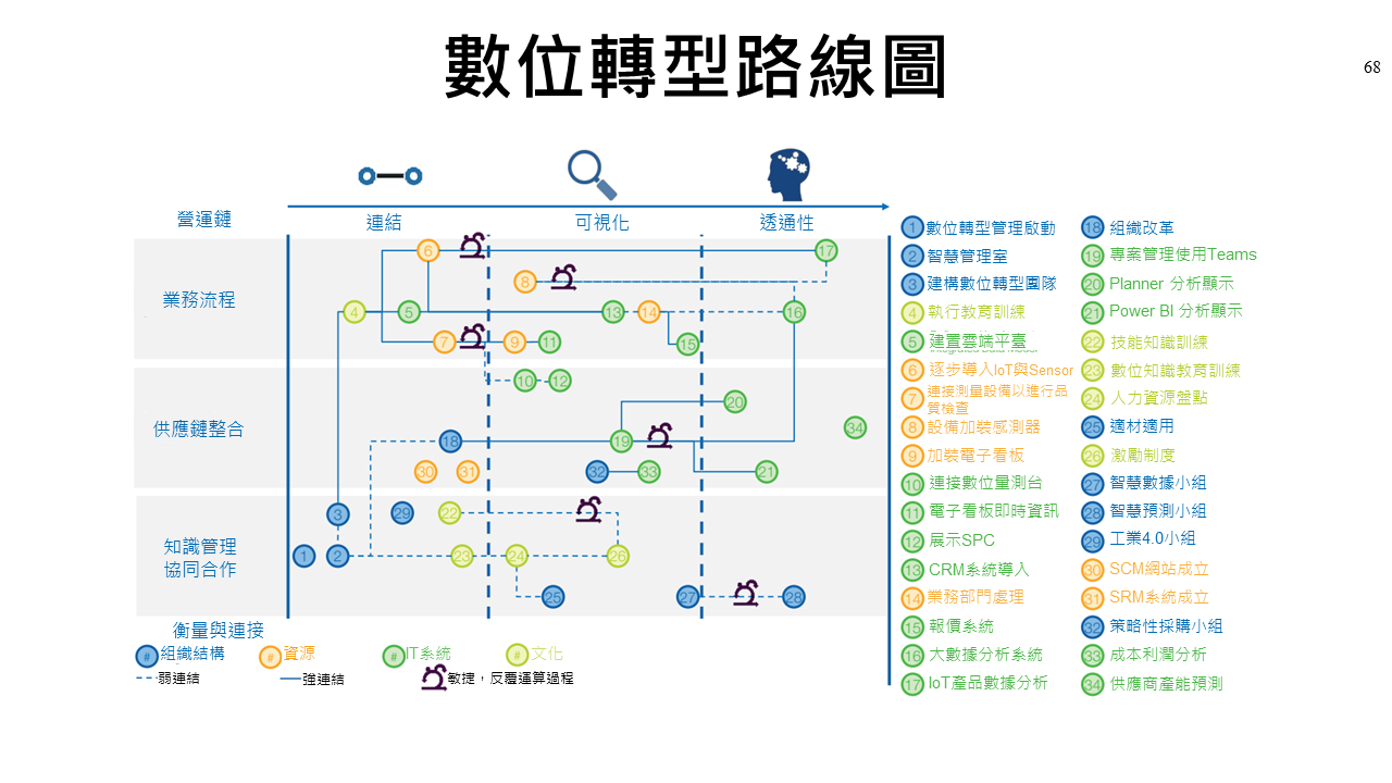 數位轉型路線圖的基礎是組織結構、資源、IT系統和文化四大構面。橫軸表示連結、可視化與通透性等不同數位轉型階段、縱軸表示業務流程、供應鏈整合與知識管理協同合作等項目。決策者可以根據公司在這些方面的現狀,以及預期的目標,來制定相應的策略。