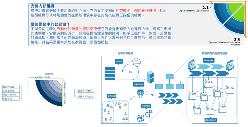 這裡的組織結構是由企業內部有機組織和價值網絡內的動態協作兩大原則組成,所以將從內部與外部兩大方面描述。