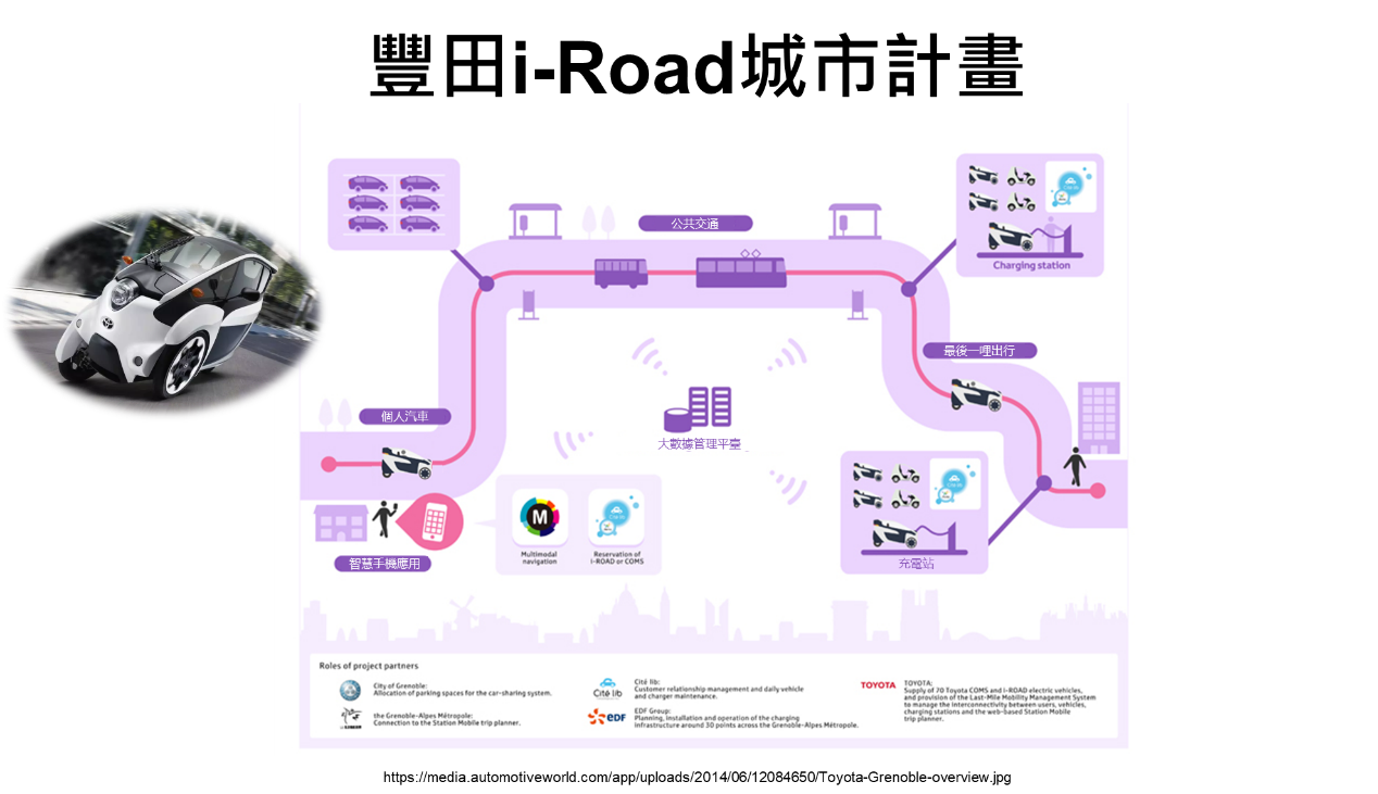 豐田在台灣所做的一個i-Road的一個城市計劃切入,就是用所謂的這個iRent/YOXI,以及豐田本身的車,去做車聯網切入,並逐步搭建成低碳智慧交通平台 (MaaS: Mobile as a server)。