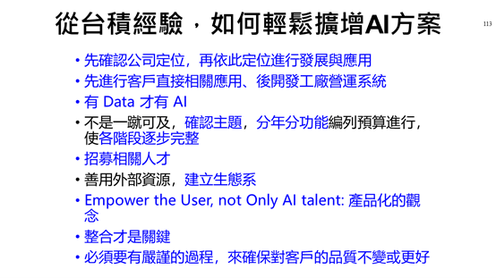將IT與AI融入產品,使最終用戶能夠受益與使用,是實現成功的一部分。而不僅僅是將技術與使用權限制於IT與AI技術人才,還應該賦予終端使用者大量應用,才能發揮最大效益。