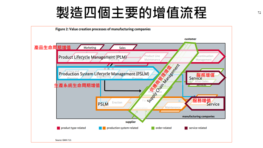 除了產品生命週期增值外,還有其他的增值流程在價值鏈中扮演重要角色。例如,生產系統生命週期增值(PSLM)是指通過優化工廠機台生產到機台維護保樣,實現更高的生產效率。另一個重要的增值流程是供應商管理增值(Supply Chain Management),是指通過優化供應鏈流程,實現更高的生產效率和更好的供應商協調,以及更快速的物流和交付。最後,服務增值(Service)專注於建立和維護與客戶之間的良好關係,提供個性化的產品、解決方案和售後服務,並實現客戶滿意度和忠誠度的提升。