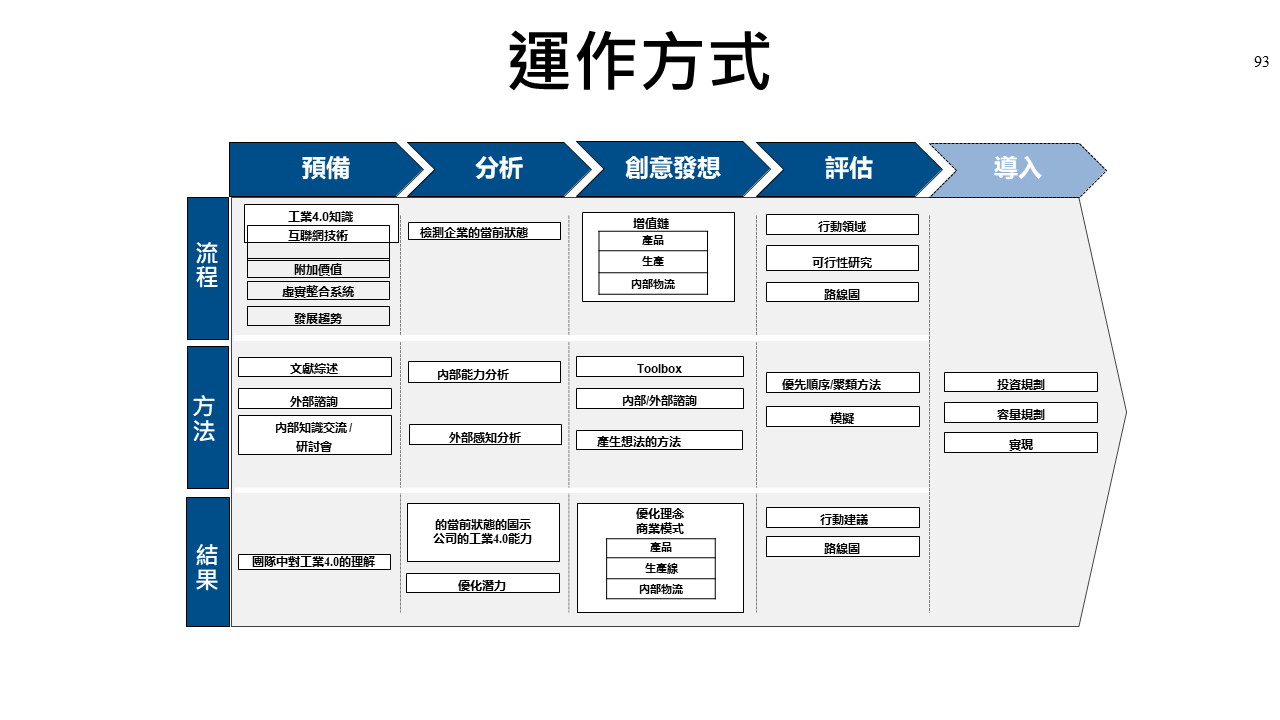 如圖1所示,橫軸是運作步驟(預備→分析→創意發想→評估→導入),而縱軸是各步驟的相關流程、方法與期望結果,接下來我們針對各步驟進行詳細說明。
